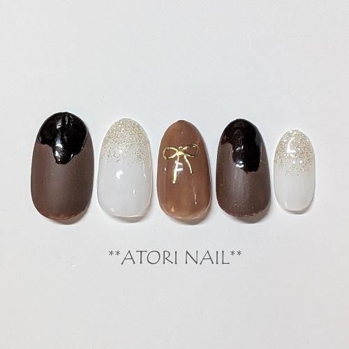 落ち着いたブラウンとホワイトでまとまたバレンタインネイル。